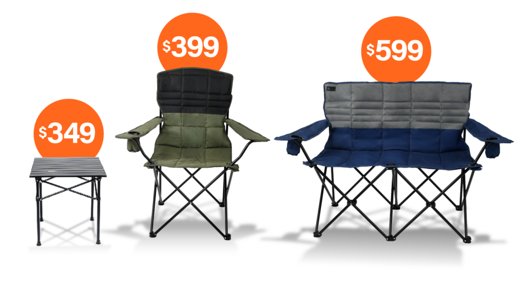 Silla individual plegable a $399, Silla doble plegable a $599 o mesa plegable a $349