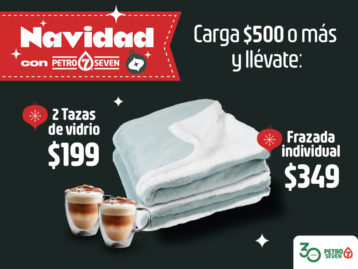 Válido del 06 de noviembre al 18 de diciembre de 2025 o hasta agotar existencias, en estaciones Petro Seven de la República Mexicana. Aplica para clientes con cargas de gasolina Magna, Premium o Diésel de $500.00 pesos o más ($400.00 pesos o más para las estaciones ubicadas en el estado de Tamaulipas), que soliciten su promocional antes de terminar su transacción. Al realizar la carga, se podrá adquirir un set de 2 tazas de vidrio por $199 o una frazada variedad de colores a $349. Solo en Nuevo León, si la carga se realiza de gasolina Premium, se podrá adquirir una Prensa Francesa a $199. No aplica con otras promociones. Métodos de pago participantes son: efectivo, tarjetas bancarias débito o crédito. No participa ningún método de pago no mencionado (no participan pagos con vales de papel o digitales). Productos sujetos a disponibilidad. Piezas limitadas. Imágenes ilustrativas. Consulta los términos y condiciones completos en: https://www.petro-7.com.mx/promociones