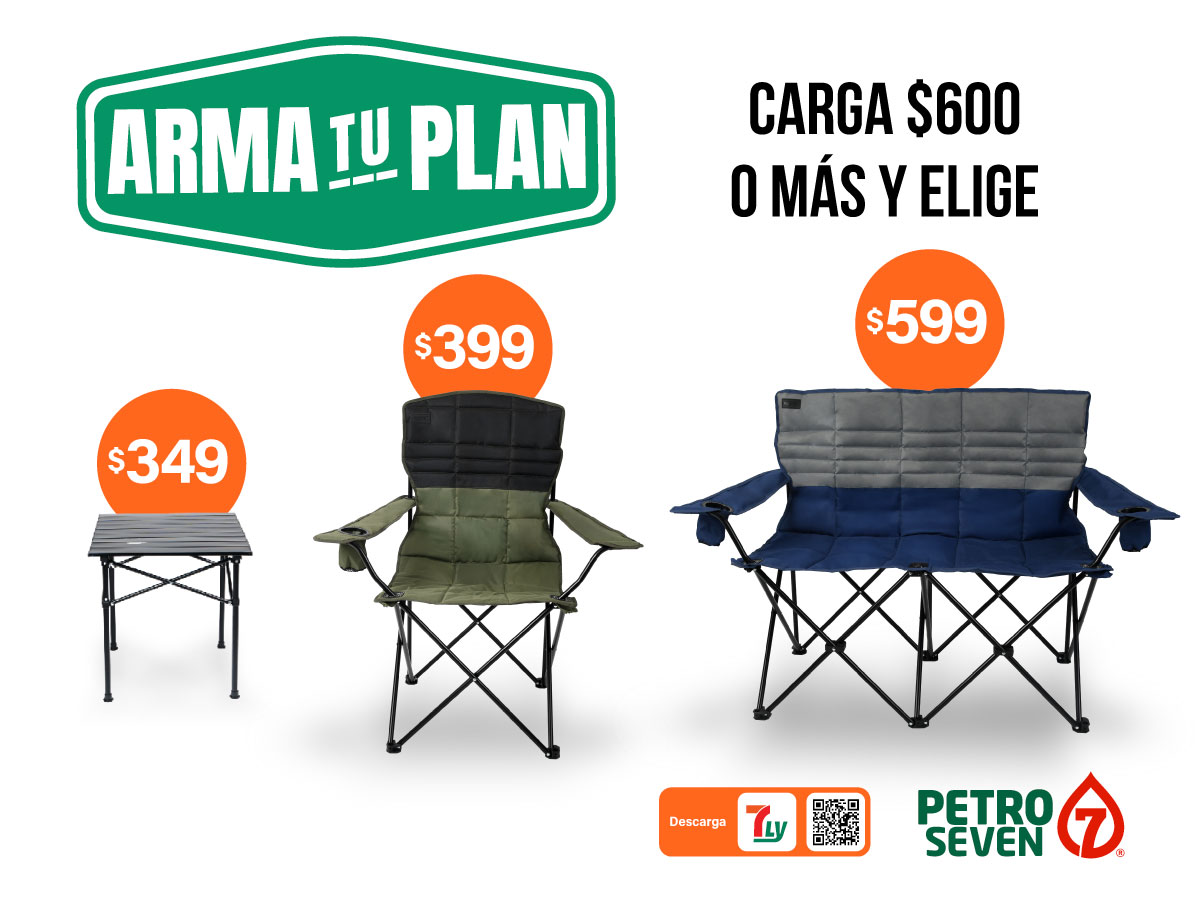 Promoción válida del 19 de febrero al 01 de abril de 2026 o hasta agotar existencias en estaciones Petro Seven de la República Mexicana. Aplica para clientes con cargas de gasolina Magna, Premium o Diésel de $600.00 pesos o más ($500.00 para las estaciones ubicadas en el estado de Tamaulipas), que soliciten su promocional antes de terminar su transacción. Al realizar la carga, se podrá adquirir una silla individual por $399, una silla doble por $599 o una mesa plegable por $349. No aplica con otras promociones. Métodos de pago participantes: efectivo, tarjetas bancarias débito o crédito. No participa ningún método de pago no mencionado (no participan pagos con vales de papel o digitales). Productos sujetos a disponibilidad. Piezas limitadas. Imágenes ilustrativas. Consulta los términos y condiciones completos en: https://www.petro-7.com.mx/promociones